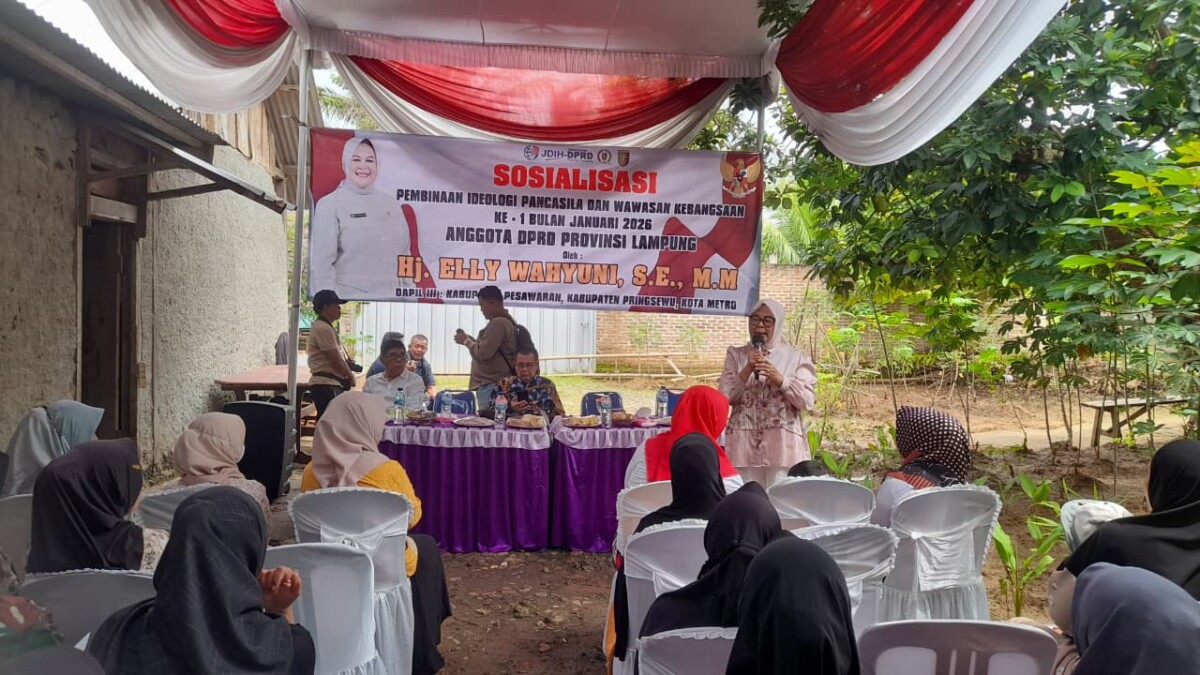 LAMANRETORIK, Pringsewu – Anggota DPRD Provinsi Lampung Daerah Pemilihan (Dapil) III, Hj. Elly Wahyuni, S.E., M.M., melaksanakan kegiatan Sosialisasi Ideologi Pancasila dan Wawasan Kebangsaan di Pekon Podosari, RT 003 RW 001, Kecamatan Pringsewu, Kabupaten Pringsewu, Minggu (18/1/2026).