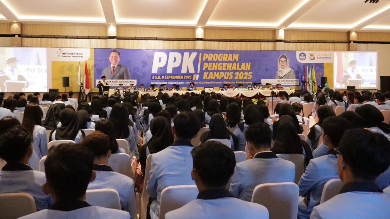 LAMANRETORIK, Bandar Lampung – Universitas Bandar Lampung (UBL) kembali menyelenggarakan Program Pengenalan Kampus (PPK) bagi mahasiswa baru tahun akademik 2025/2026. Kegiatan berlangsung selama dua hari, 8–9 September 2025, dengan rangkaian aktivitas akademik maupun non akademik yang dipusatkan di Convention Hall Mahligai Agung Pascasarjana UBL, Kampus Dra. Sri Hayati Barusman.